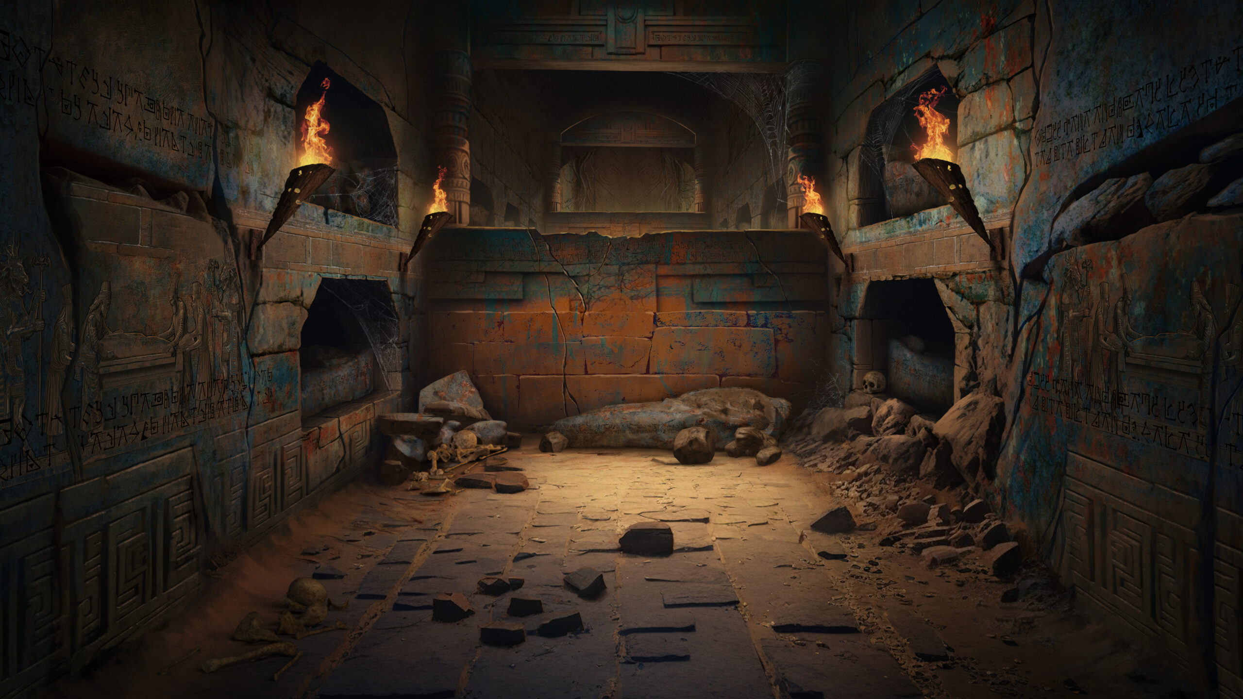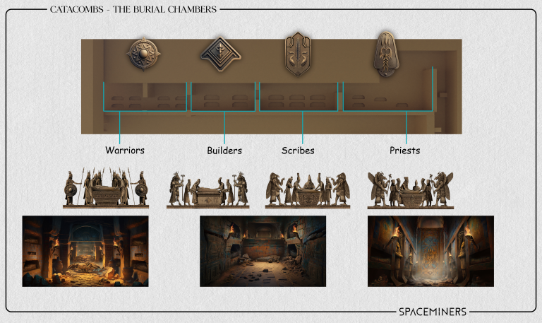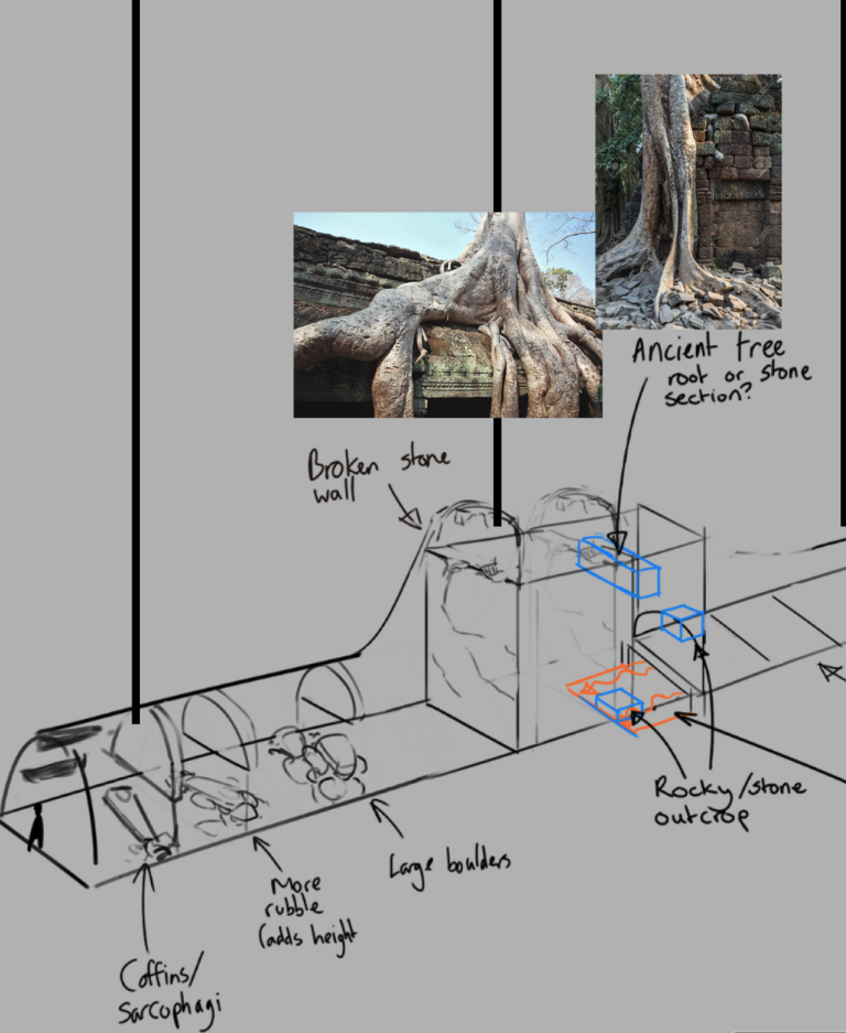 To create the Burial Chambers, we started with some sketches to understand the layout and design. We asked questions like who was buried there, what was their importance to the ancient Coram Nobis civilization, and why they were buried there. This helped us create a detailed plan for each section of the catacombs, including the assets required for each section.